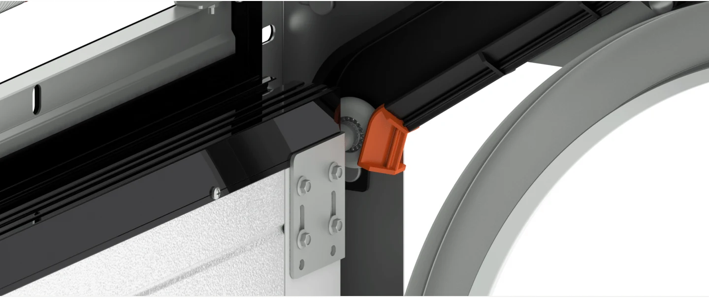 Мы используем ролики на шарикоподшипниках для бесшумного скольжения. Мы также минимизировали количество соединений на направляющих. Благодаря этим решениям дверь движется плавно и быстро. Каждая изготовленная дверь, независимо от размера, легко открывается одной рукой, без применения силы. Это достигается благодаря двум торсионным пружинам, обеспечивающим оптимальную балансировку двери.
