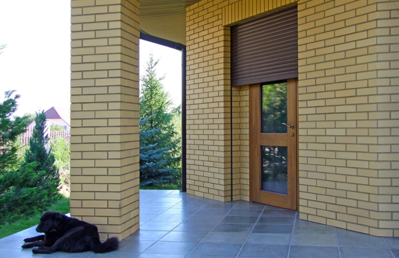Решение, позволяющее «скрыть» короб в фасаде здания. Благодаря отсутствию лишних деталей экстерьер будет выглядеть лаконично и стильно. Использование при установке рольставней встроенного короба нужно учесть на этапе проектирования здания.